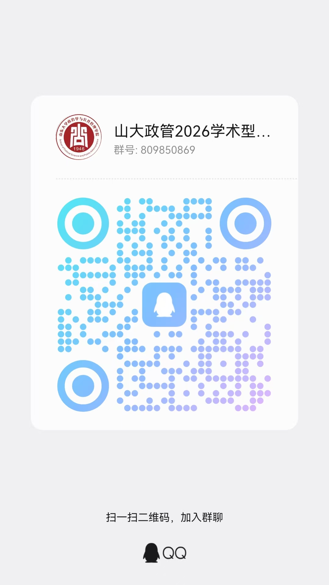 学院将组建考试QQ群(群号809850869,二维码附后)。该群仅限进入初试(笔试)的考生本人进入(名单以学院公示名单为准),入群请提供“考生姓名+报考专业+考生身份证号码后六位”以等候验证。进群后,所有考生应将“群昵称”修改成“姓名+报考专业”。待所有考生入群后,我院将正式启用QQ群发布消息,请考生时刻关注群通知。
