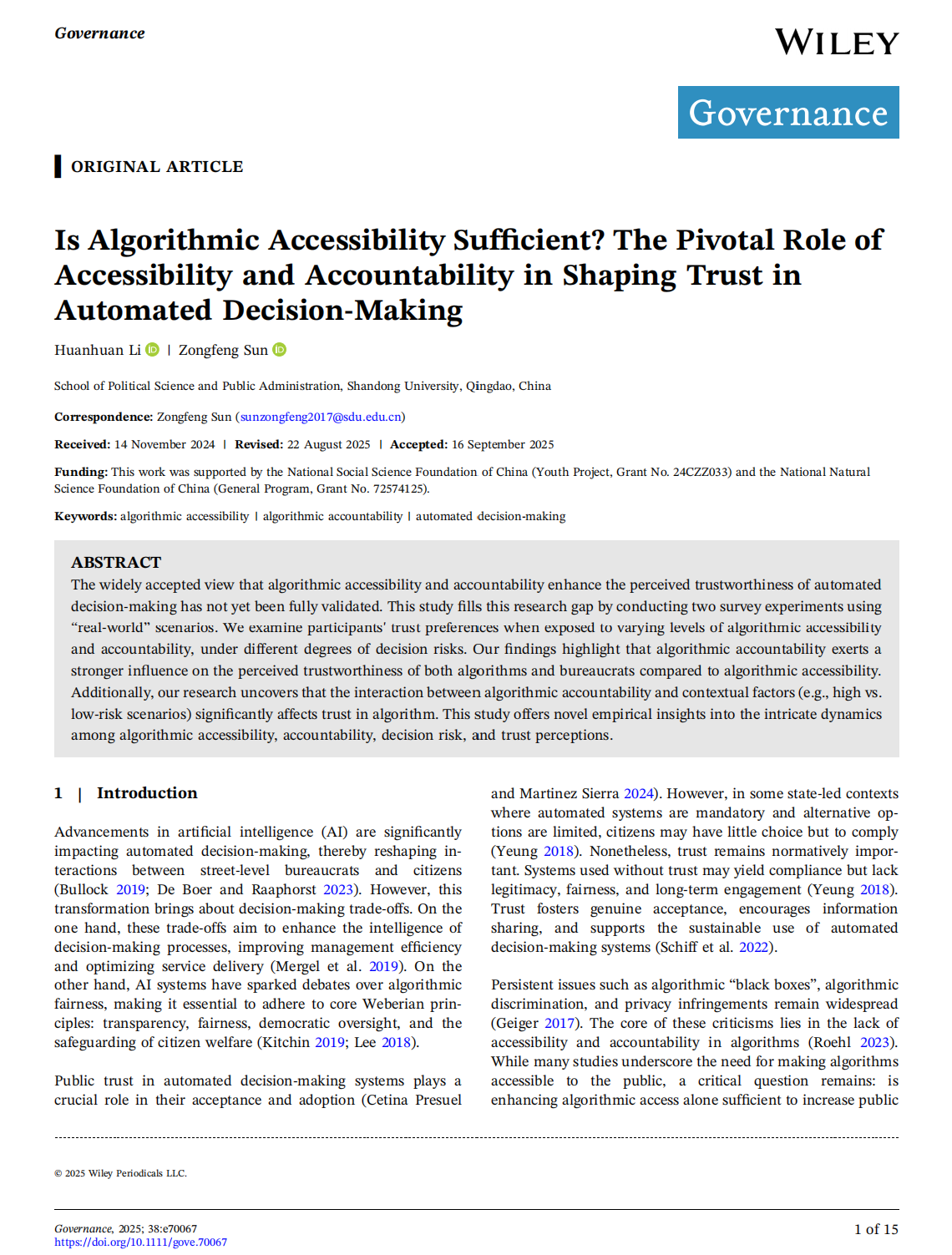 近日,山东大学政治学与公共管理学院李欢欢助理研究员(第一作者)与孙宗锋教授(通讯作者),共同在AJG(ABS)四星级期刊、公共管理国际期刊Governance在线发表学术论文“Is Algorithmic Accessibility Sufficient? The Pivotal Role of Accessibility and Accountability in Shaping Trust in Automated Decision-Making”。