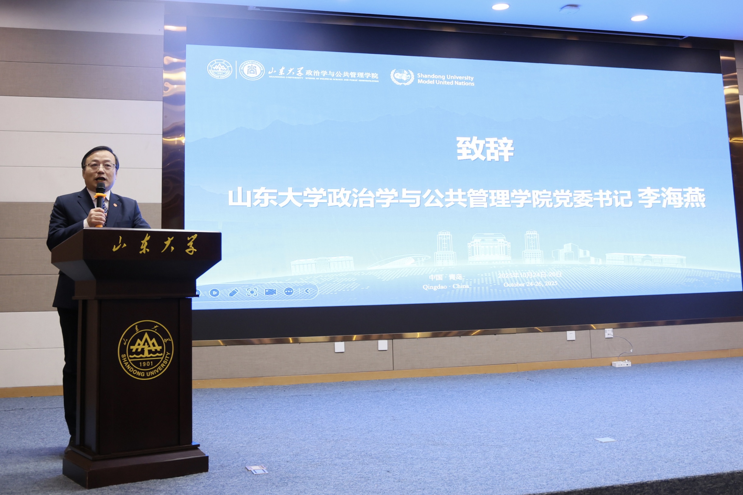李海燕在致辞中表示,山东大学政治学与公共管理学院长期致力于全球治理与公共政策的前沿研究,积极推动跨学科交叉融合与国际化人才培养,在各项模拟联合国活动中屡创佳绩。希望与会青年学子以参加此次模拟联合国大会为契机,积极参与各项议题讨论与磋商,通过务实的思想交流与智慧碰撞,为解决全球治理问题提供可行的思路与方案,积极促进多元文化与文明互鉴研究,为人类和平与发展崇高事业贡献更多青年智慧与担当。