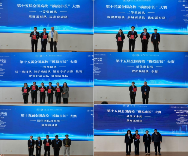 经过激烈角逐,来自山东大学的“莱财莱财”团队、“福寿食康”团队获得一等奖;青岛大学的“胶澳数航”等3支团队获得二等奖;青岛大学的“以一敌百”等5支团队获得三等奖;“莱财莱财”团队获得最佳文本奖;“涟漪清风”团队获得最佳团队风采奖;“智护晚晴”团队的李想同学获得最佳市长奖。