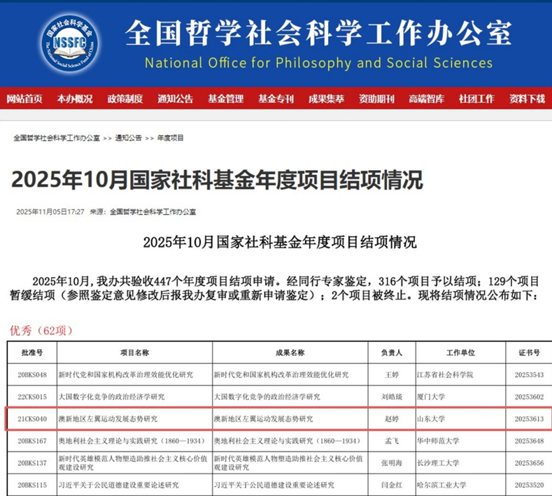 由山东大学政治学与公共管理学院、当代社会主义研究所赵婷教授主持的国家社会科学基金青年项目《澳新地区左翼运动发展态势研究》(项目批准号:21CKS040)在2025年10月的国家社科基金结项鉴定中获评“优秀”。这一成果不仅丰富了当前学术界有关澳新地区左翼运动的系统研究,也为世界社会主义运动研究提供了区域国别视角的创新探索,彰显了研究团队扎实的学术功底与前沿的问题意识。