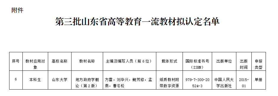 近日,山东省教育厅印发《山东省教材委员会办公室关于公布第三批山东省普通高等教育一流教材名单的通知》(鲁教材委办〔2025〕1 号),经学校推荐、专家评审等环节,政治学与公共管理学院方雷教授主编《地方政府学概论(第2版)》教材成功入选。这是继2020年方雷教授主编《当代中国政府与政治》与《政治科学研究方法概论》、王佃利教授主编《现代市政学(第四版)》、滕玉成教授主编《公共部门人力资源管理》、高永贵副教授主编《公文写作与处理》等教材获选山东省高等教育一流教材后,政管学院在教材建设与教学改革领域获得的又一成果,充分彰显了学院在教材建设方面的扎实成效。