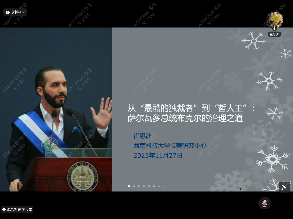 11月27日,由山东大学政治学与公共管理学院、山东大学亚太研究所主办,亚太研究所拉美研究中心承办的“社科与人文”系列讲座第三十八讲在线上成功举办,讲座题目为“从‘最酷的独裁者’到‘哲人王’:萨尔瓦多总统布克尔的治理之道”。本次讲座由西南科技大学拉美研究中心崔忠洲副教授主讲,亚太所拉美研究中心主任李振教授主持,亚太所大国关系与地区安全研究中心副主任季丽新副教授、亚太所拉美研究中心助理研究员史话担任与谈人。
