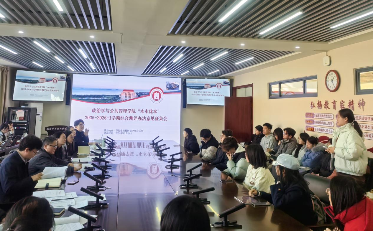 为进一步了解学生学习状况与课堂教学运行情况,广泛征求学生对综合测评办法的意见建议,持续提升学院教学管理与服务水平,政治学与公共管理学院于 12 月 4 日召开2025-2026学年第一学期期中教学检查座谈会暨综合测评办法意见征集会。学院领导、教师代表、本科教务秘书、各年级辅导员及四十余名学生代表参加会议。