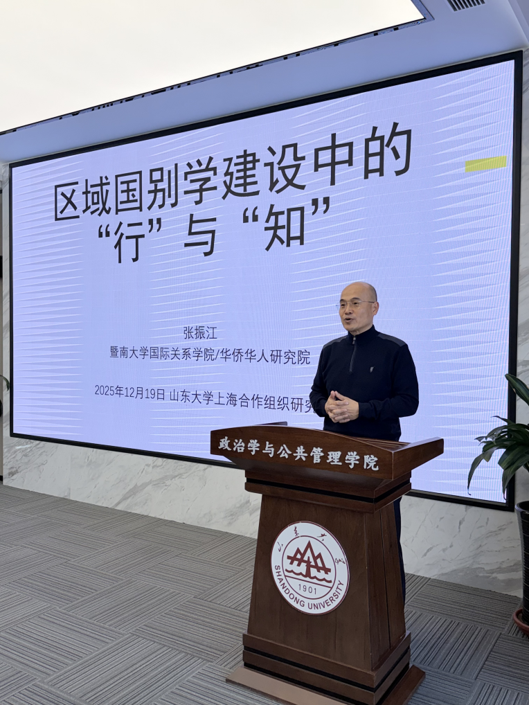 12月19日上午,由山东大学政治学与公共管理学院、山东大学上海合作组织研究院、山东大学公共安全研究院、中国—上海合作组织经贸学院联合主办的“合作与发展”系列讲座第三十四期在青岛校区举办。本期讲座特邀暨南大学国际关系学院与华侨华人研究院教授、教育部人文社科重点研究基地主任、C刊《东南亚研究》主编张振江担任主讲嘉宾,主题为“区域国别学构建中的‘知’与‘行’”。山东大学特聘教授、泰山学者特聘专家、上海合作组织研究院执行院长盛力主持讲座,政管学院及法学院部分师生二十余人参加了本次学术交流。